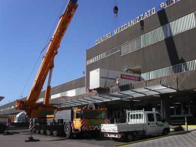 | Hier die etwas außergewöhnliche Einbringung der Maschine. In einigen Ämtern in Italien stehen die Anlagen in der ersten Etage und die Lastenaufzüge sind nicht groß genug. Da muß man eben improvisieren. | Während des Ausladens der 3t schweren Drum. | ||||||||||||||||||||||||||||||||||||||||||||||||||||||||||||||||||||||||||||||||||||||||||||||