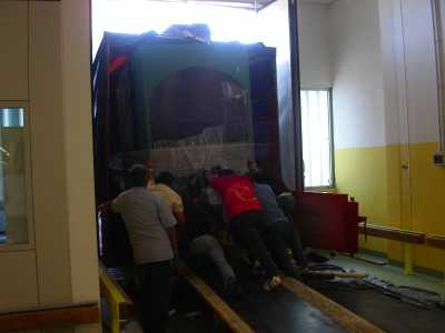 | Hier die etwas außergewöhnliche Einbringung der Maschine. In einigen Ämtern in Italien stehen die Anlagen in der ersten Etage und die Lastenaufzüge sind nicht groß genug. Da muß man eben improvisieren. | Während des Ausladens der 3t schweren Drum. | ||||||||||||||||||||||||||||||||||||||||||||||||||||||||||||||||||||||||||||||||||||||||||||||
